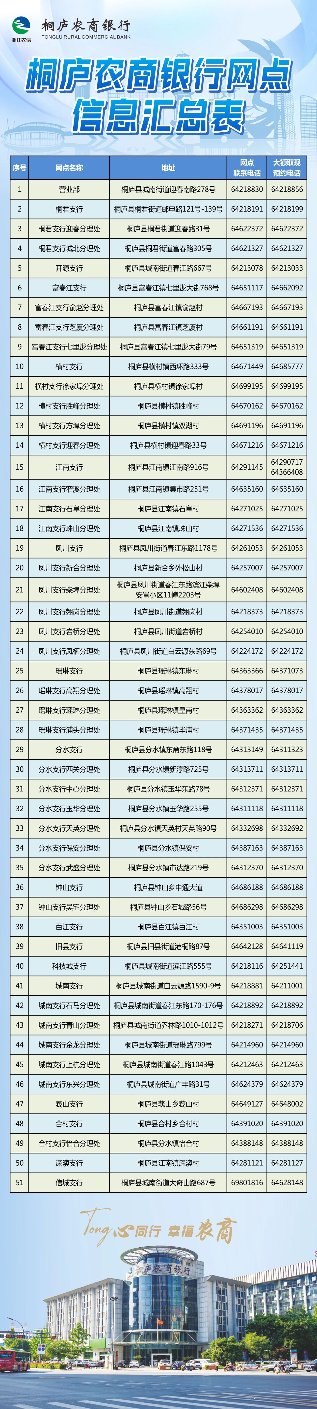 2 | 江南支行 | 本级 | 桐庐县江南镇江南路918号 | 64291145 | 周一至周六,8:00-17:00 (节假日休息) |
