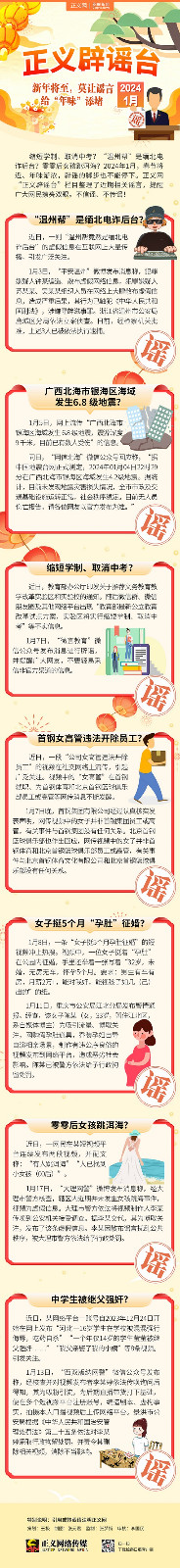 缩短学制、取消中考?“温州帮”是缅北电诈后台?零零后女孩跳洱海?2024年1月,春节将近、年味渐浓,辟谣的脚步也不能停下。正义网“正义辟谣台”栏目整理了近期相关谣言,提醒广大网民擦亮双眼。不信谣、不传谣!