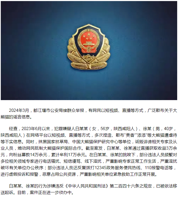 散布大熊猫谣言嫌疑人被依法移送起诉
