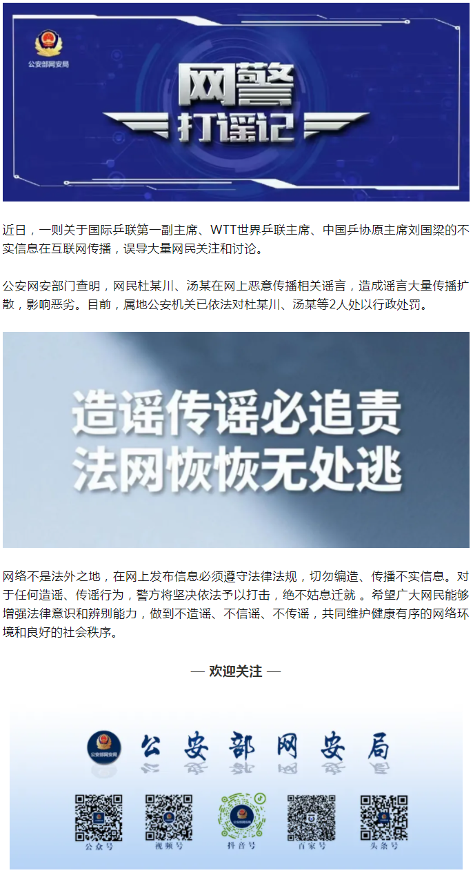 网警打谣:传播涉刘国梁不实信息,2人被处罚