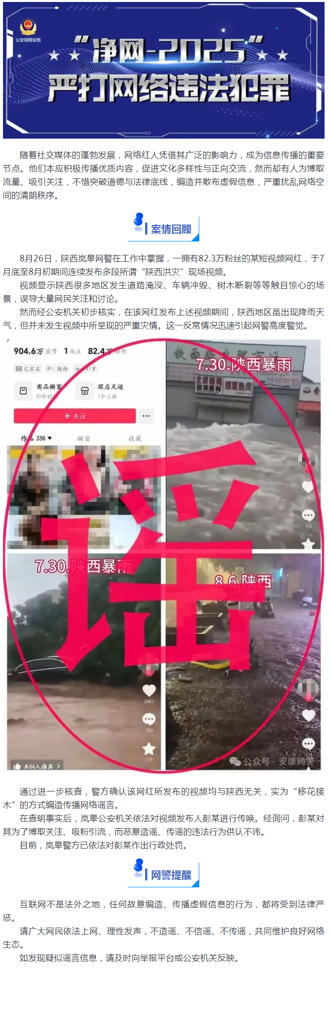 网络谣言零容忍!82万粉丝网红谎报灾情被处罚