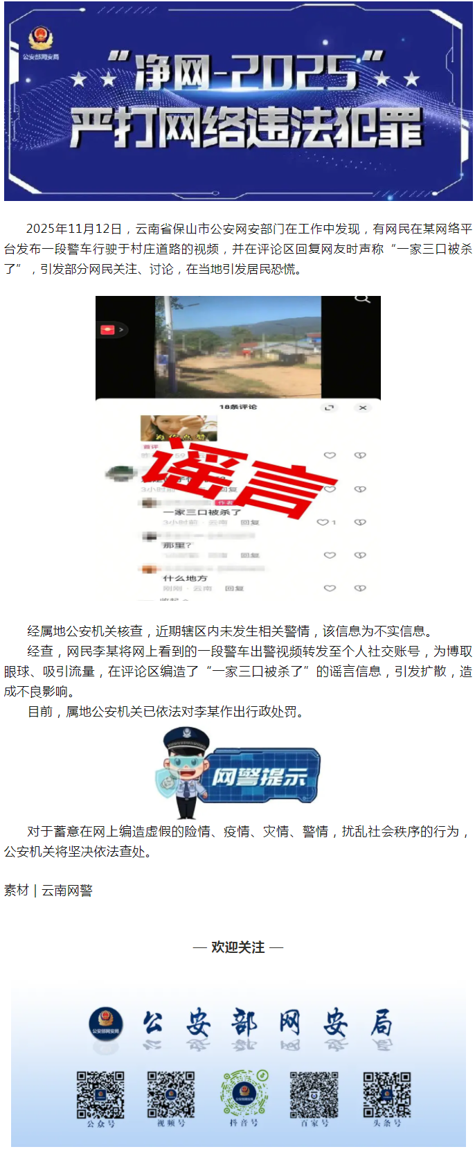 净网—2025|编造“一家三口被杀害”虚假警情,网警依法查处